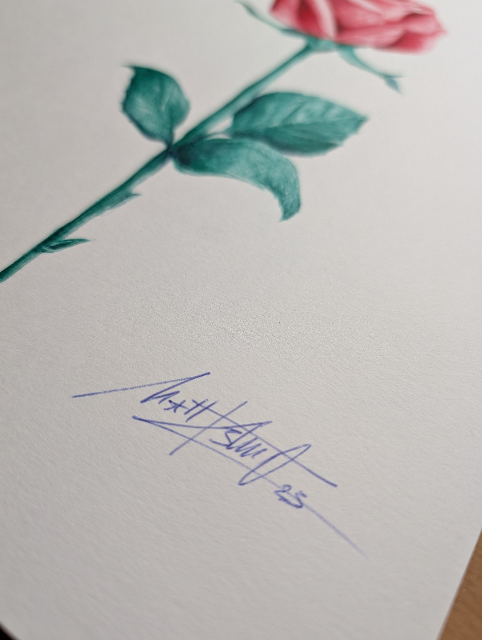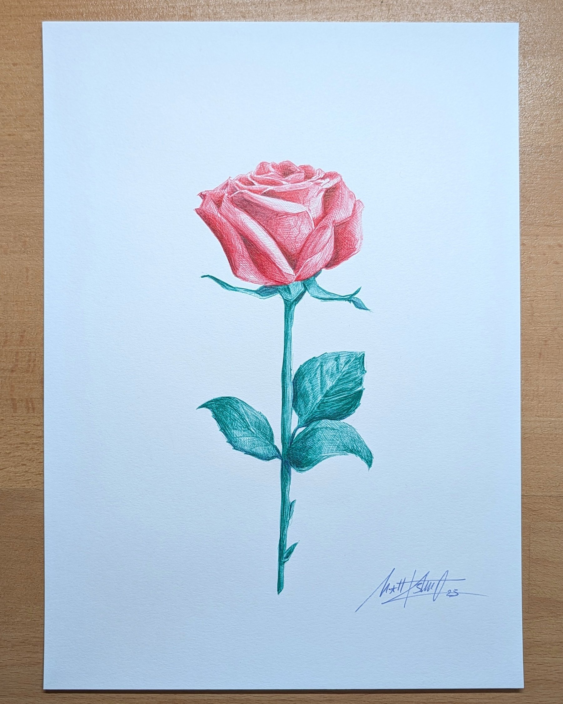 Réalisée entièrement au stylo BIC 4 couleurs, elle joue sur les nuances et la superposition des encres pour donner vie à chaque pétale. C'est une interprétation moderne et vibrante d'un symbole intemporel.